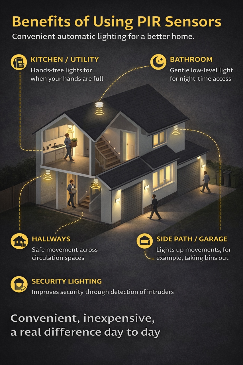 Not all good lighting requires complex systems. Some of the most effective improvements come from very simple measures. One of these is the use of PIR (passive infrared) sensors. They detect movement and turn lights on automatically. Used properly, they can improve convenience, enhance safety, reduce energy use, and add a layer of security. What Is a PIR Sensor? A PIR sensor detects movement and changes in heat (body presence). When triggered, it turns lights on and switches them off after a set period. They can be used internally and externally. Internal Use: Practical, Everyday Benefits Hands-Free Lighting · Ideal for kitchens, utility rooms and pantries · Lights come on automatically when hands are full Gentle Night-Time Lighting · Bathrooms, hallways and landings · Low-level lighting avoids disturbing sleep · Improves safety at night Circulation Spaces · Corridors and staircases · Improves safety and convenience · Reduces need for multiple switches External Use: Security and Guidance Security Lighting · Deters intruders · Lights activate only when movement is detected Guiding Movement Around the Home · Paths, side access and bins · Safe and convenient movement · No need for manual switching Design Considerations · Correct positioning is critical · Avoid unnecessary triggering · Set appropriate sensitivity and timing · Use comfortable light levels Do Not Overcomplicate It PIR sensors are inexpensive, easy to install and highly effective without complex systems. Final Thought Sometimes the simplest solutions make the biggest difference. PIR lighting is one of those. Next Steps If you are planning a renovation or upgrade, consider where automatic lighting would genuinely improve daily use and how it can be integrated simply and effectively.
